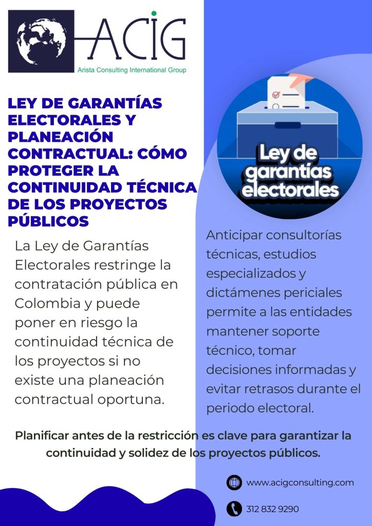 La Ley de Garantías Electorales y planeación en proyectos públicos no debe abordarse únicamente como una restricción legal, sino como un factor crítico de planeación técnica y contractual. Anticipar la contratación de estudios, peritajes y consultorías permite proteger la continuidad de los proyectos y garantizar decisiones técnicas sólidas durante todo el periodo preelectoral.